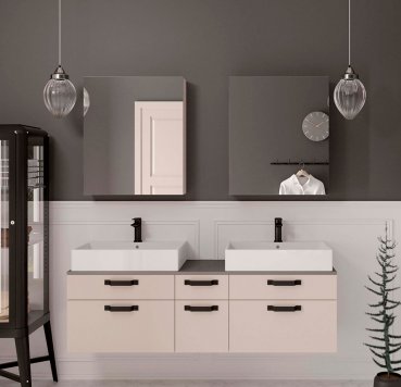 Vores badmiljøer er lavet som et ”sæt”, hvor du får alt inkluderet, som du skal bruge for at få et funktionelt badmiljø (skabselement, vask, armatur og spejl). Vi vil gerne sørge for at give den bedste pris – derfor har vi samlet priserne for det samlede badmiljø. I dette menupunkt, Badeværelse, finder du de forskellige sæt/opstillinger, vi tilbyder. Du kan skifte låger, bordplader m.m., så det kommer til at passe præcis til dine ønsker.