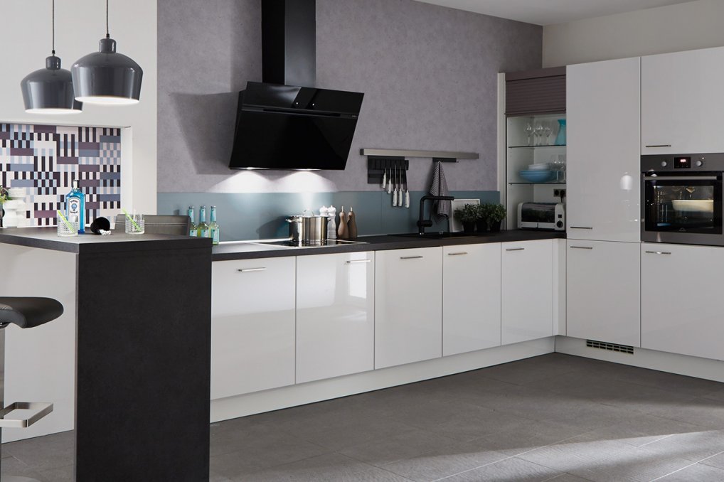De moderne køkken tendenser viser, at den hvide farve er kommet for at blive, da den passer perfekt ind i de fleste lyse hjem. Med dette moderne villa køkken i højglans får man det nyeste look inden for køkkener. Den sorte tidløse bordplade er populær i køkken mode, da den bryder med de hvide låger på en super enkel og elegant måde, og er med til at udtrykke eksklusivitet.