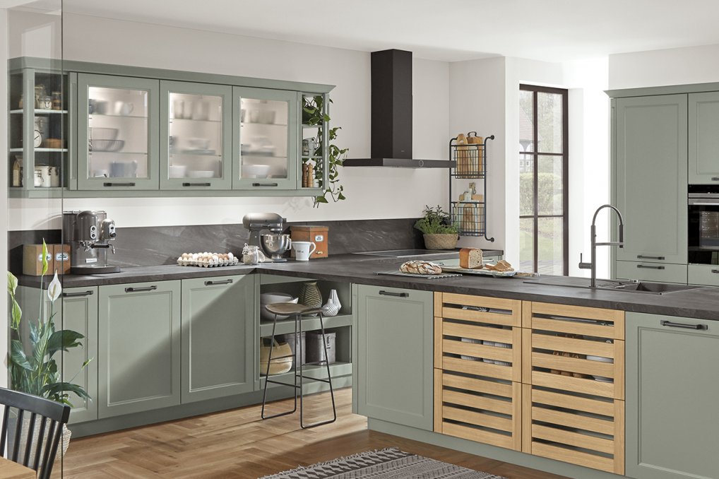 Den charmerende Cascada-låge er en låge med udskæringer, der vil pryde ethvert køkken. Den romantiske stil har i dette køkken fået et twist med en svag, grøn farve. Efter en årrække hvor indretning tenderede til at holde sig til kontrastfarver som hvide vægge og sorte pynteting, er vi nu atter klar til at invitere farverne ind i hjemmet igen. Denne grønne køkkenlåge tilfører en rolig stemning til køkkenet, som bliver flot afrundet med en grå bordplade.