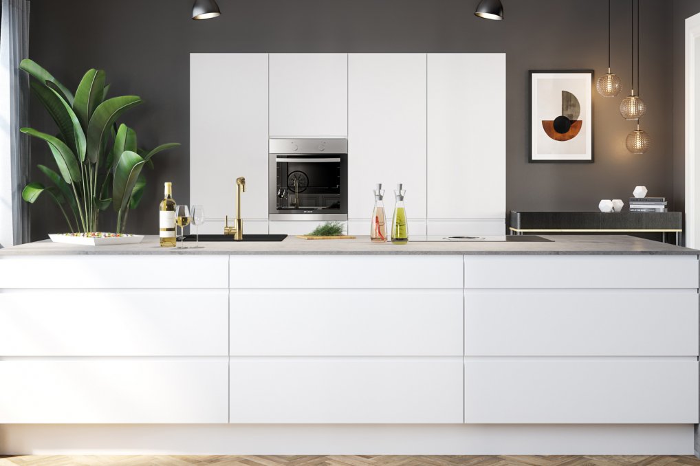 Den minimalistiske stil giver dig uanede muligheder for enten at bevare den moderne og enkle stil, idet lågen i sig selv er grebsfri og stilfuld. Du kan også vælge at tilføje et mere herskabeligt eller landligt præg ved at tilpasse det rum, køkkenet skal stå i. Det kunne fx være ved at give en af væggene en grå farve, som det ses her i køkkenet samt ved tilbehør og pynt i trælook mm. Du får altså med dette design alverdens muligheder for at personliggøre dit køkkenrum!