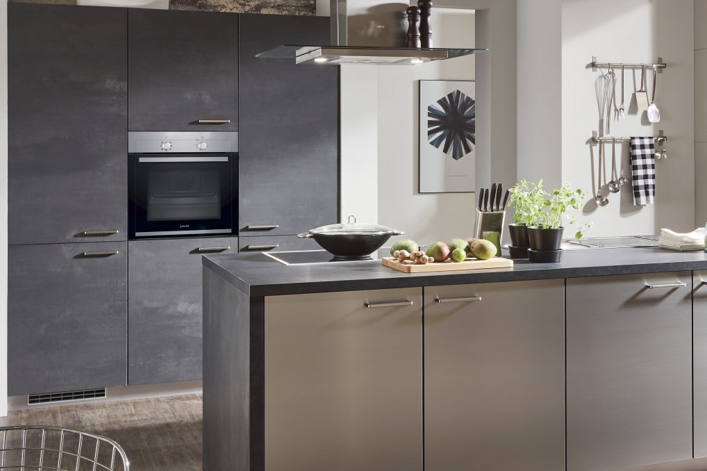 Färgerna i köket är hållna i tidens stora trend; nämligen kontrastfärger. Här är det en grå Inox-dörr som tillsammans med den svarta Laser-dörren med cementstruktur står i vacker kontrast till de vita väggarna, som är inbäddade i ljus från de stora panoramafönstren.